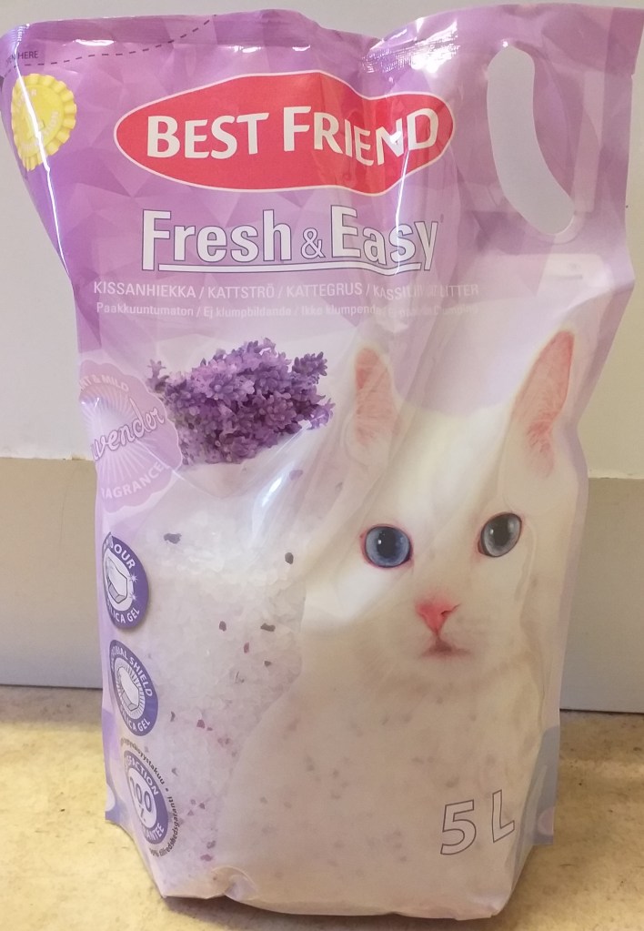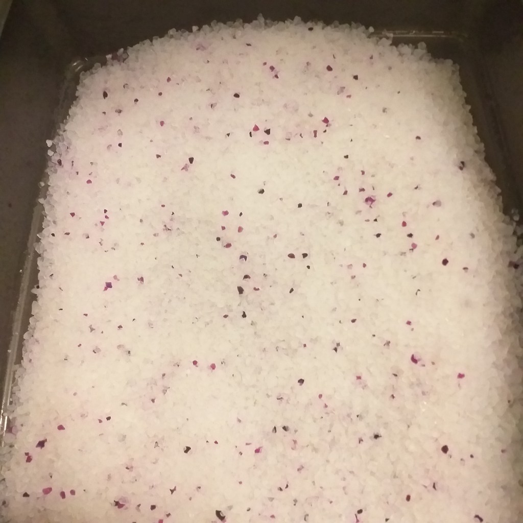 Intryck: Kristaller i vitt och olika lila färger. Dammade lite. Spike talade om sin åsikt direkt. Såg att han var inne och tassade i sanden och gick ut. En halvtimme senare hittade jag bajs i soffan. Suck… Har nu konstaterat att kristaller inte går hem i alla fall. Efter att dag två hunnit fånga Spike när han skulle pissa i soffan, gav jag upp och bytte till nästa sand på listan. Fick ingen chans att bilda mej någon uppfattning om hur sanden. Sparar den att ha som utfyllnad vid något senare tillfälle.