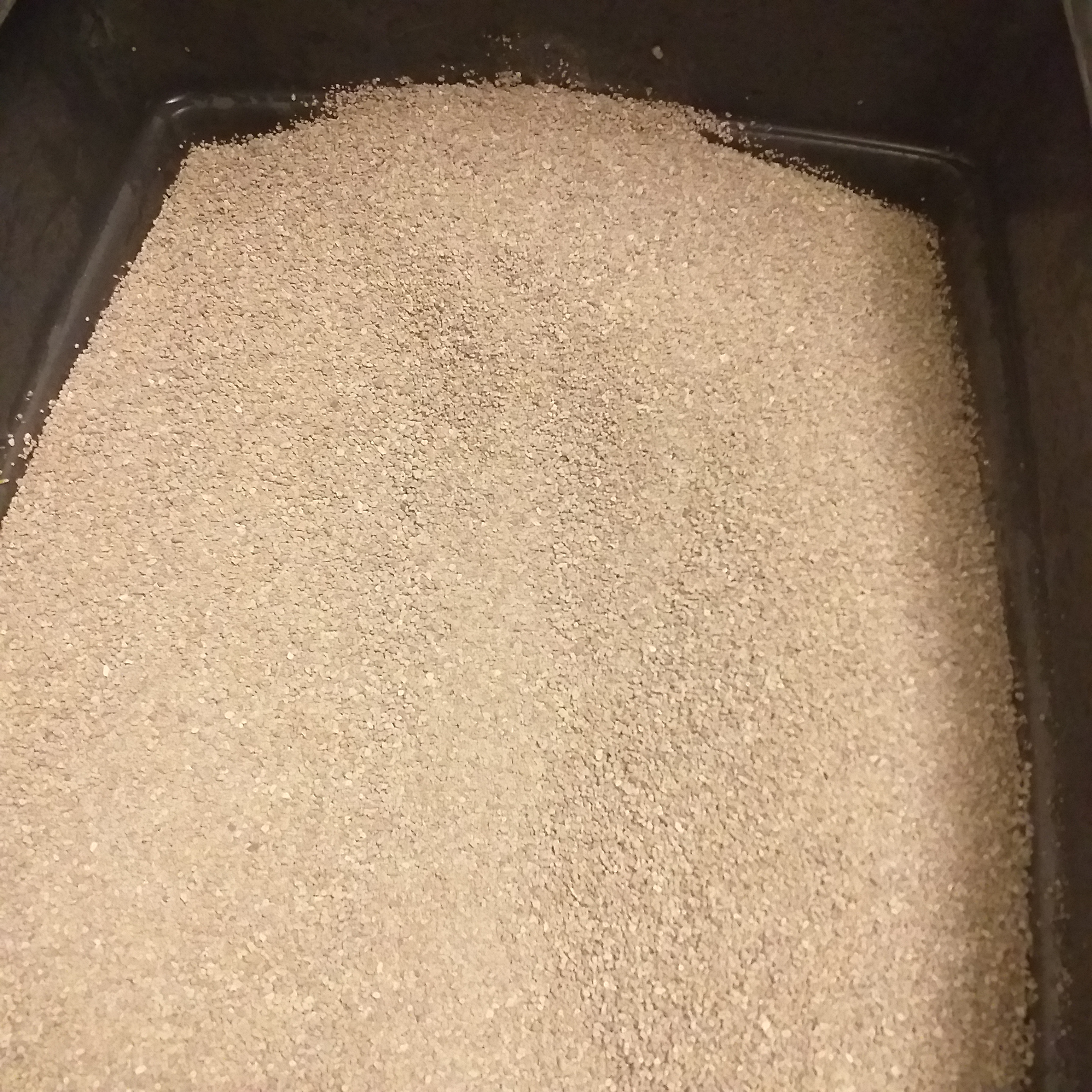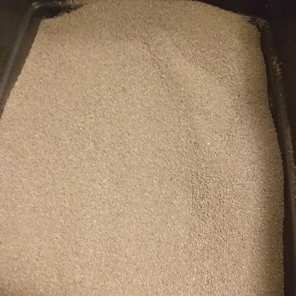 Intryck: Bådar inte gott att den här sanden också dammade otroligt mycket när jag hällde upp den (om min teori stämmer alltså). Eftersom det är en tioliters påse så hällde jag upp hälften av sanden. Lite grövre, ljusgrå sand som inte bildar klumpar. Spike verkade inte fatta tycke för denna alls då han inte gick på den överhuvudtaget, om inte jag var bredvid. Den var dessutom jobbig eftersom den inte bildar klumpar och det var svårt att få upp något av kisset. Sanden räcker en vecka till, men jag byter till en annan sort ändå, så får vi se om jag använder resten någon annan vecka.