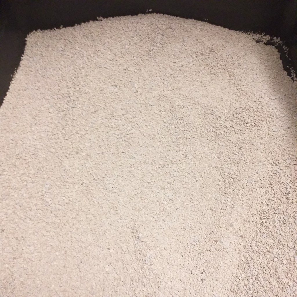 Intryck: Dammade oerhört när jag hällde upp den. Hällde upp halva påsen. Sanden kändes väldigt lätt, med stora korn. Den stökar ner väldigt då kornen verkar flyga överallt. Spike pissade på fel ställe fem av sju dagar – inte bra. Har lika mycket sand kvar, så får tyvärr bli en vecka till med samma sand. Positivt var att den bildade bra klumpar, som var lätta att plocka ur.