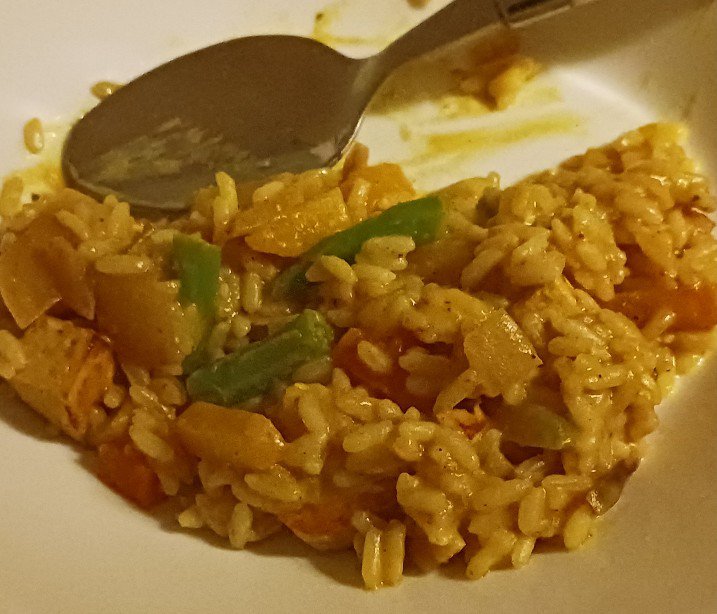 Lagade en salig blandning. Maten som jag hade gjort innan var så himla mycket kcal i eftersom det var kokosmjölk i, så jag ville ha en annan rätt än den som jag åt till lunch. Den här blev 104 kcal/100 g och består av sommargrönsaker (från Lidl), lök, röda linser, gula ärtor, kidneybönor, ris, sambal oelek och en jäkla massa andra starka kryddor. Blev väl ingen smaksensation, men det smakade bra och blev massvis! Inte lika söta som manatees, men ändå trevliga.