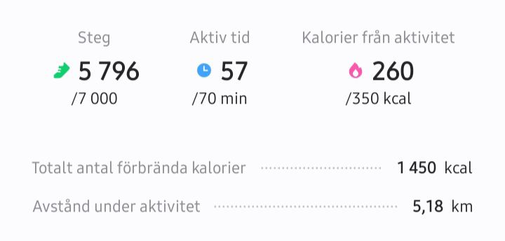 Ökade målen till 7000 steg, 70 min och 350 kcal från 6000/60/300.Angav kalorimålet till 1000 kcal fr.o.m. idag också. Ätit ca. 850. Kom hem och lagade god mat. 78 kcal / 100 g (bra!)