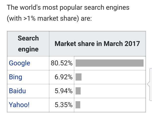 Antar att Baidu är Kinas sökmotor. Bing används väl bara av folk som råkat installera deras search bar och medföljande reklam (teknidioter mao), så min slutsats blir att Yahoo får ”pityvotes” (pitysearches?) och har gamla överhängare som är på utdöende.