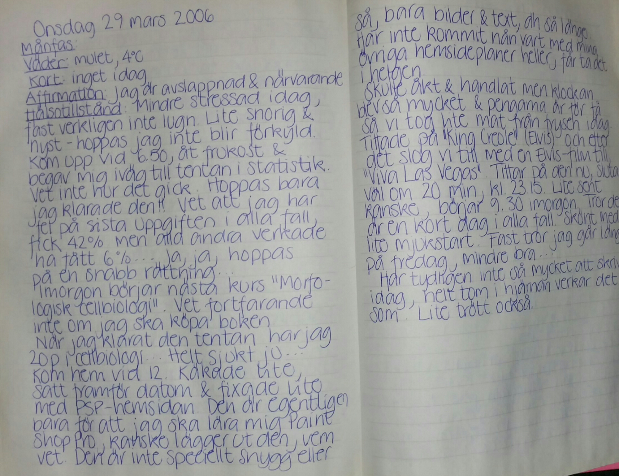 Hittade inte alla mina dagböcker – de flesta ligger förhoppningsvis i förrådet, eller har blivit förstörda – men tre stycken låg i mammuten (det är ett IKEA-skåp, för den som inte vet det) och en av dem innehöll inlägg från månaden mars, så det är det jag lagt upp bild på. Jag var väldigt mycket inne på tarotkort, meditation, affirmationer och Wicca då. Var då, 2006, fortfarande ihop med min första pojkvän. Vi var ihop 1997 – 2007. Lite roligt att läsa ändå nu, när man inte längre saknar personen, eller mår dåligt över att det tog slut. Dessutom känns jag så ung, trots att det bara är 10 år sen. Mystiskt hur mycket man kan förändras, växa, bli annorlunda.