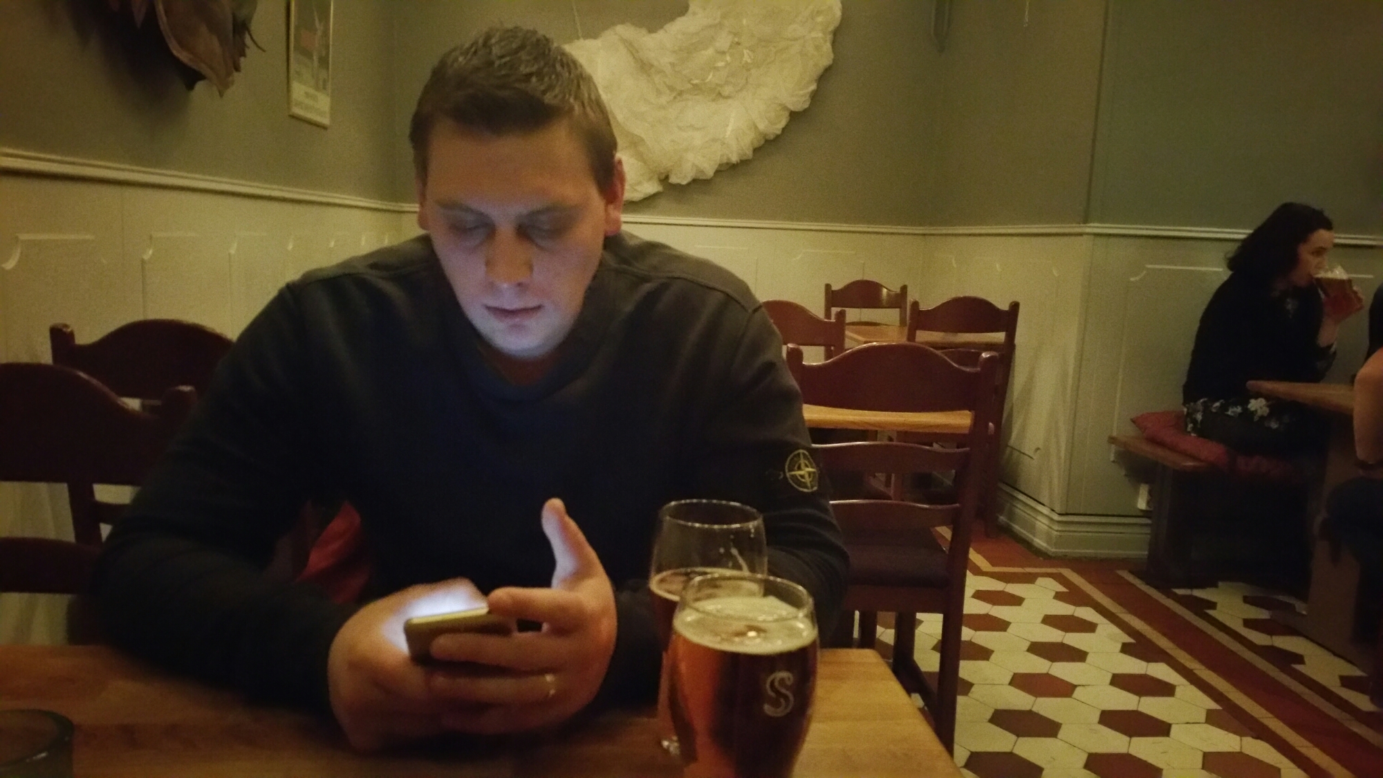 Seriöst, hade han tömt hela sellerisaltburken i drinken?! Så besviken. Gick och klagade, så klart, men svaret blev att de inte ”gör om” drinkar. Extremt dåligt. Det enda bartendern gjorde var att försöka spä ut den med mer tabasco… Snål som jag är, dricker jag den, men grimaserar efter varje klunk. Kinderna sugs in som det gör när saker är salt.