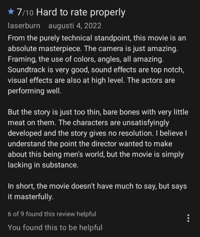 Jag hade väldiga problem att rösta på den här filmen. Den började jättebra (typ en 7:a eller 8:a), men slutet var så jävla confusing ochrandom att betyget sänktes rejält till 4/10.Andra verkade tycka som mej. Felix har gjort sej hemmastadd och detta är en mysig plats med kanonutsikt.