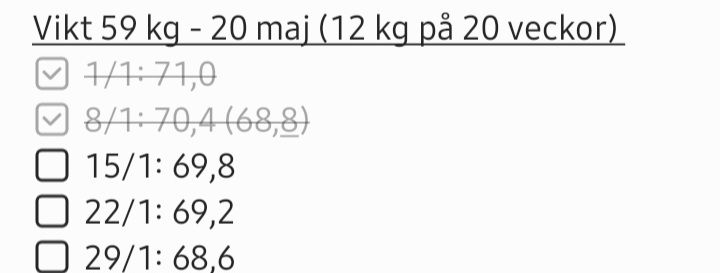 Vikt: 64,3 (-6,7) [åt ca. 1000 kcal igår, -1,0 skönt!]