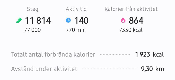 Vikt: 65,6 (-4,4) [åt ca. 1000 kcal igår, 0 trots min enorma promenad]