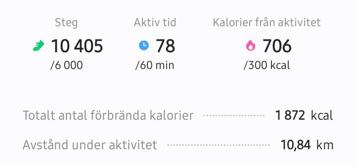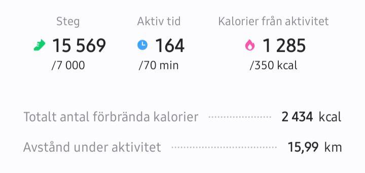När jag hade kommit upp från sängen igen på eftermiddagen, så åt jag lite lunch, bryggde kaffe och spelade mina mobilspel. Jag har ju lovat mej själv 50 aktiva minuter och komma ut varje dag, men jag satt bara och sköt upp det med inställningen att dagen redan var förstörd ändå eftersom jag hade sovit bort så mycket. Jag började sen bli hungrig och eftersom jag hade ätit upp min sista mat, så fick jag ta tjuren vid hornen och röra på arslet. Jag insåg om jag bara går rakt fram och tillbaka till Lidl, så blir det inte 50 minuter, så jag bestämde mej för att ta en omväg runt i en cirkel. Det slutade med att det blev 70 minuter och 7.300 steg (5,8 km). Starkt jobbat!