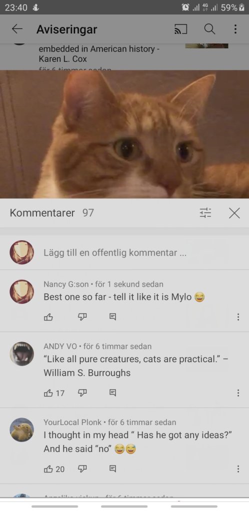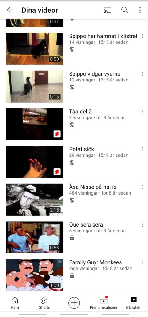 När jag ändå höll på, kollade jag Youtube också. Har tydligen lagt upp 107 videos, varav (typ) 98 % är felines, sedan 2013.