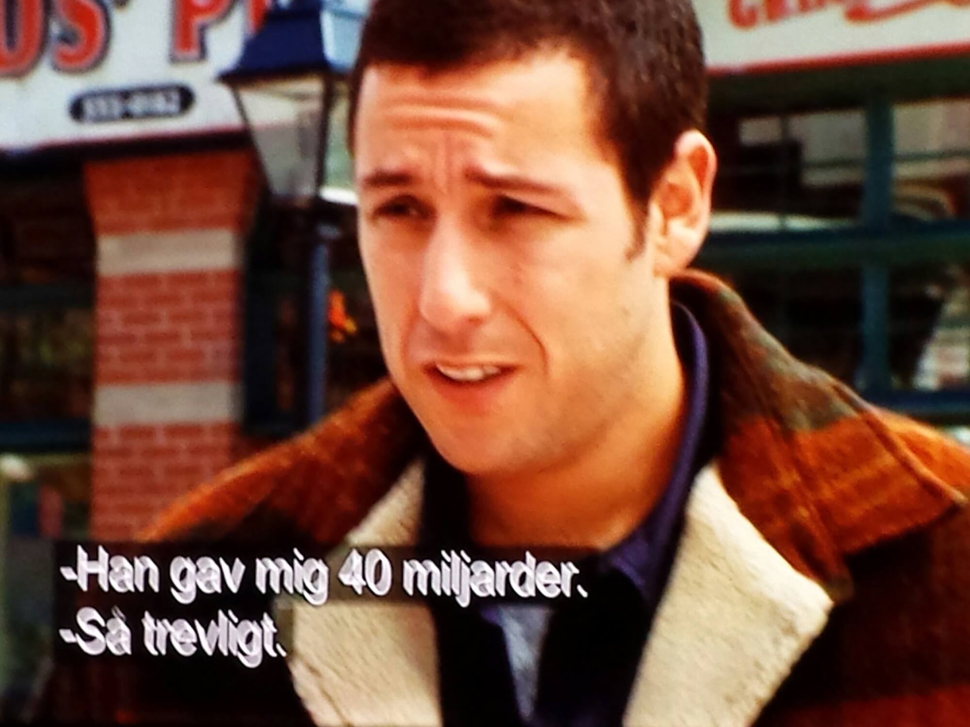 Blev Adam Sandler. Fan, vad skönt att få kolla utan hån! Haha, jag vet, ”guilty pleasure”. Ser ”Big Daddy” (1999), som jag inte sett förut. (Ja, jag gillar Jim Carrey också, so sue me, he!)