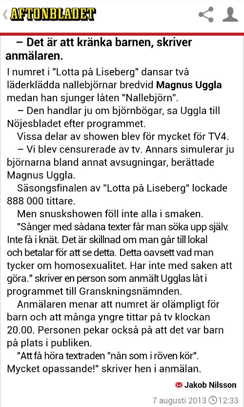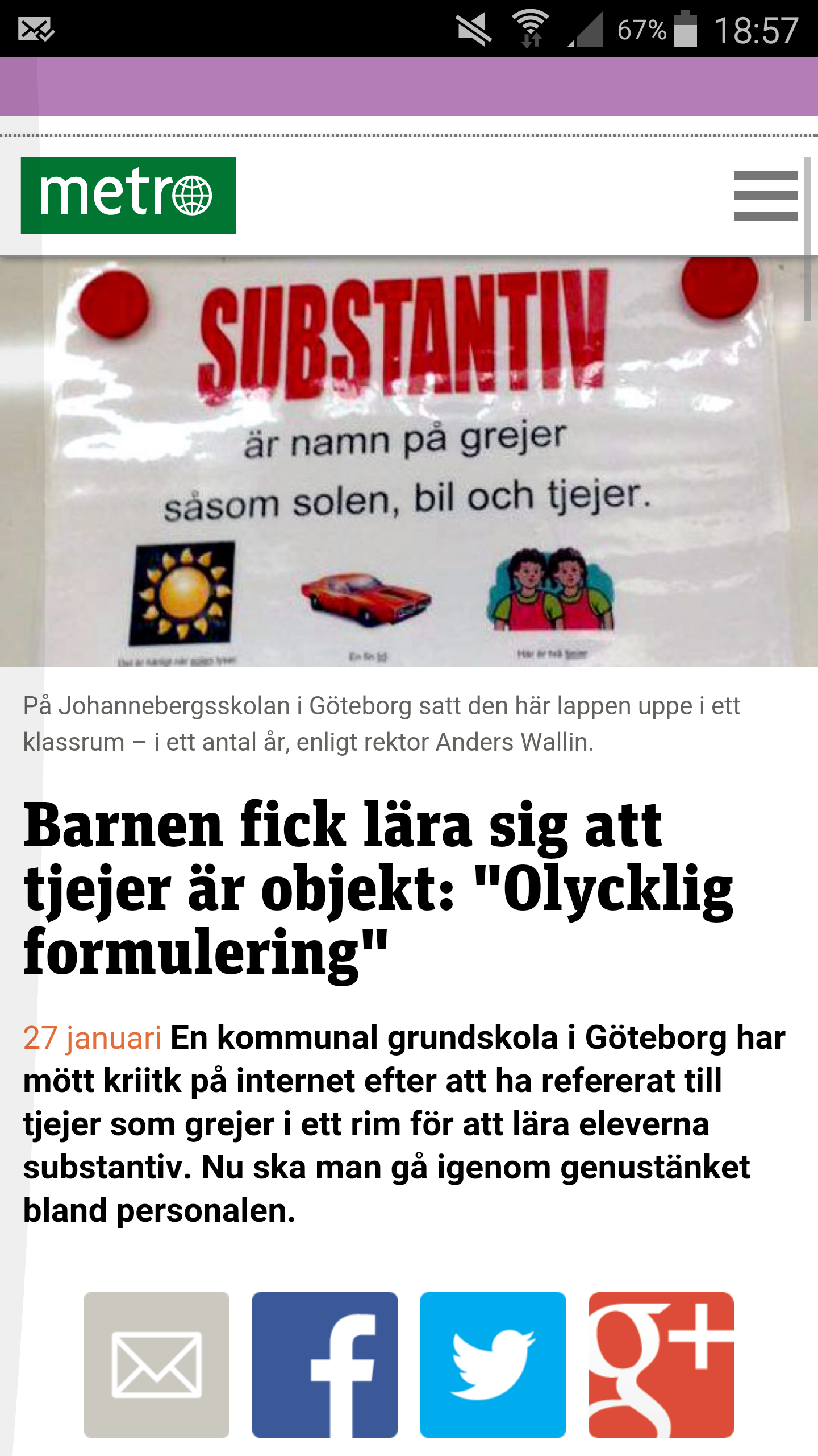 Blir bara så jäkla trött. Så ett rim för att lära barn vad substantiv är, är nedvärderande mot kvinnor. Seriöst? Vem har tagit illa upp mot denna vers? Vem? Ingen, är svaret. Den enda som ”tagit illa upp” är hon som anmält det hela. Det var inget problem innan någon gjorde det till ett problem. Varför har detta blivit en slags hobby bland 80-talister (utgår jag från) idag? Ska vi återgå till någon slags ”hitler-censur”? Är det det ni vill? Jag vill ha tillbaka mitt 80-tal (innan Siwert och hårdrockshysterin)!