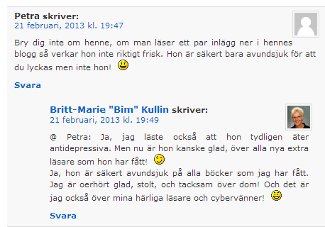 Men… Desto roligare för oss. Alla Bims recensioner innehåller följande ord i olika konstellationer: lättläst, spännande, gripande, mycket bra, lite invecklad, osannolik, ser fram emot nästa, rekommenderas, tycker mycket om, mycket bra, lite besviken, lite överdriven, godkänd, svårläst, svår att förstå och få grepp om, engagerande, aktuell, precis lika bra som…, intressant, krypande, småläskig, välskriven, rörande, fängslande etc.
