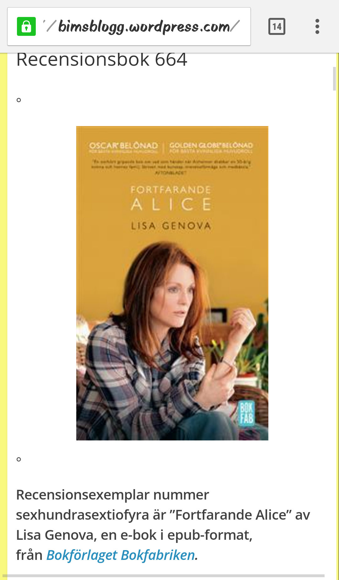 Nu får vi inte ens en recension längre, bara vilken bok i ordning hon har erhållit.