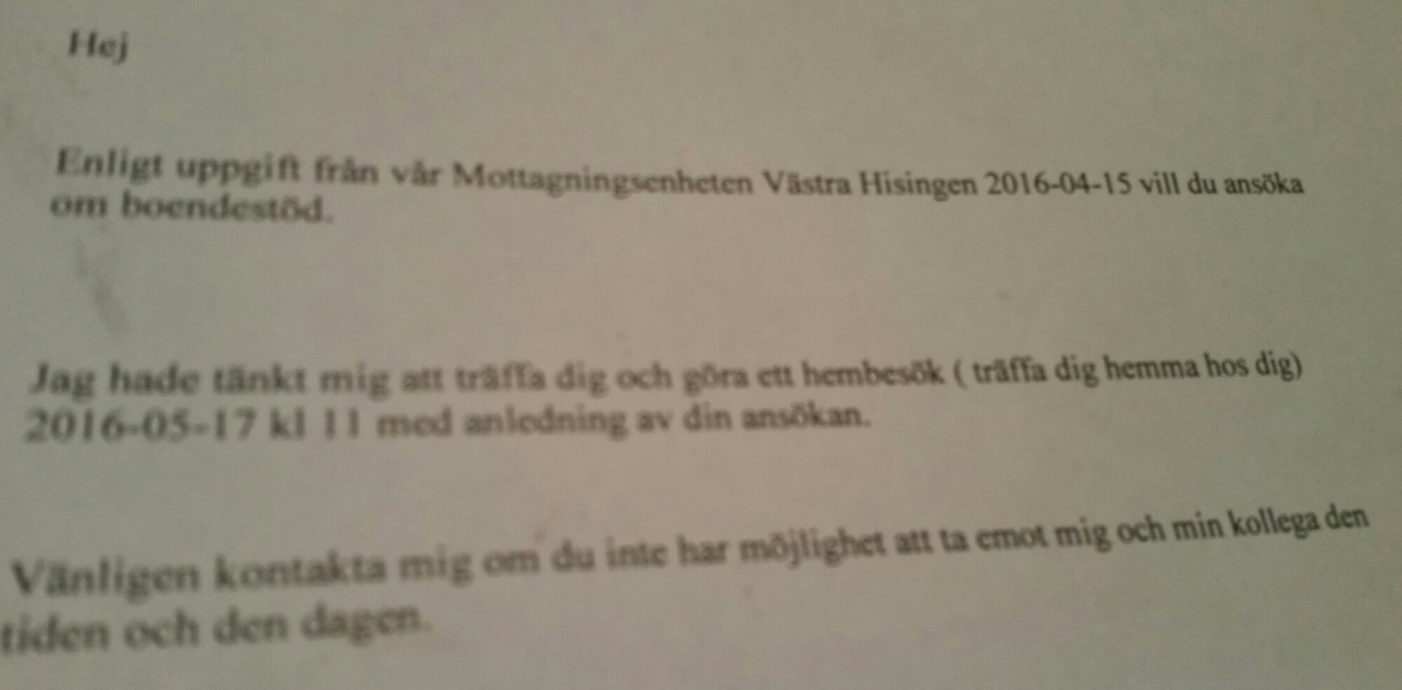 ”Det stämmer att du inte har fått någon mer kontakt efter hembesöket och jag har inte skickat någon blankett hem till dig, jag beklagar.