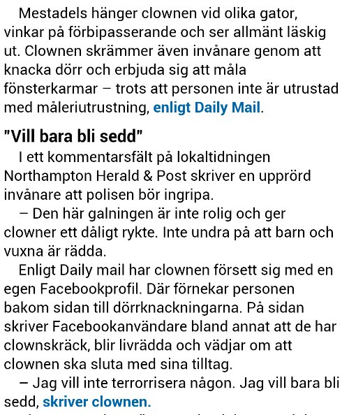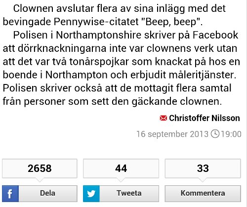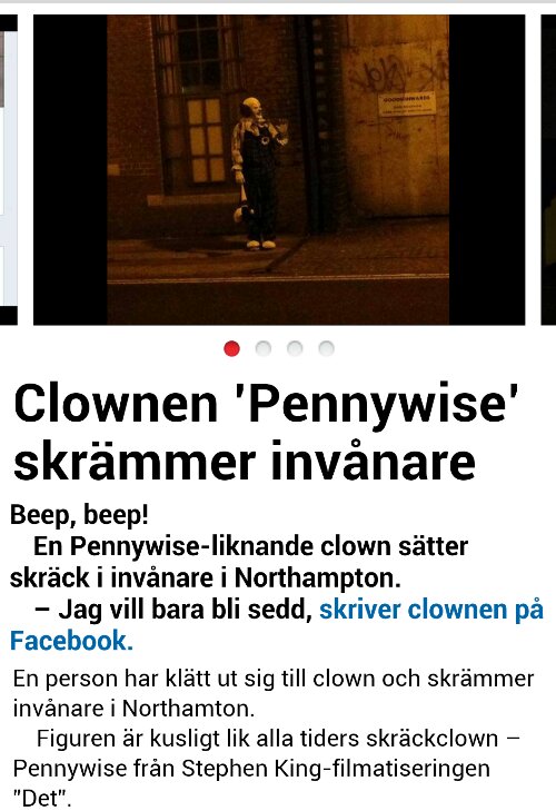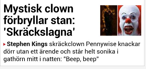 Clowner… 11 oktober 201611 oktober 2016Penardun Aftonbladet, Internetsidor, Samhällskritik Etiketter:clowner Lämna en kommentar Jag är så less på den här ”trenden”. Jag hatar clowner, likt många med mej (speciellt de som såg ”IT” i unga år) och jag förstår grejen. Det är bara så förbannat tråkigt och överhypat att jag bara blir trött. Så, kom inte hit till Sverige, please. Vill du verkligen dela? Tjohoo! Tryck: Klicka för att e-posta en länk till en vän (Öppnas i ett nytt fönster) E-post Dela på TumblrMerTweet Klicka för utskrift (Öppnas i ett nytt fönster) Skriv ut Klicka för att dela på Reddit (Öppnas i ett nytt fönster) Reddit PocketGilla Laddar in …