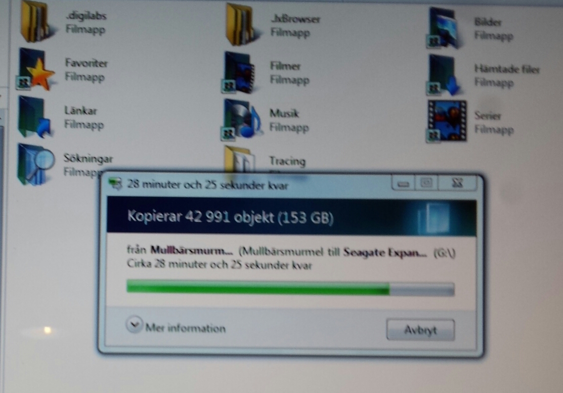 Lyckades få igång monstret och kört igång backup på allt. 153 GB. Snart klart efter ca två timmar. Känns tryggt. Tråkigt bara att inte ha en riktig dator. Saknar min älskade Asus 😦