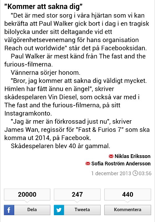 Alltid tragiskt när sånt här händer! Imponerad över antalet kommentarer på artikeln i Aftonbladet. Aldrig sett så många på en skådisrelaterad död förut.