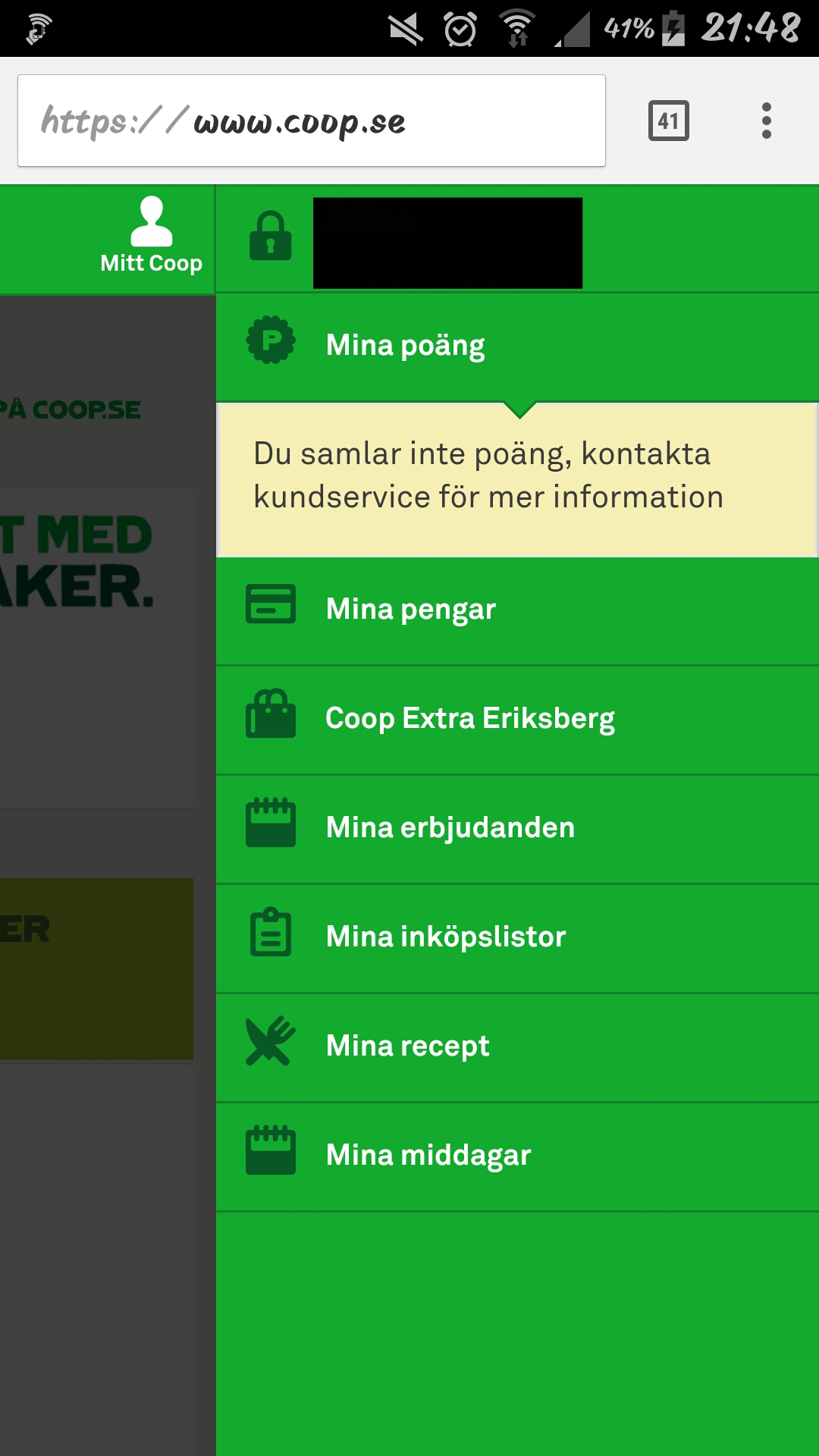 Det äckliga, mordhotande exet och jag hade kvar Coop-kortet ihop. Jag sket i detta eftersom jag är/var den enda som använde poängsystemet (svarade på enkäter osv). Nu upptäckte jag att de senaste enkäternas poäng gått in på det gemensamma kontot, men att jag inte längre har tillgång till dessa poäng. Kul, satte precis in 69 poäng som gick till psycho-mordhotaren.