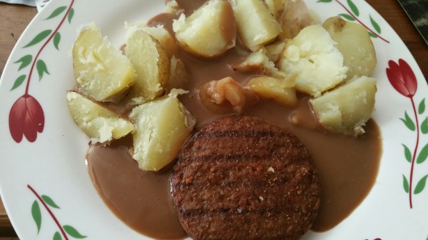 Klassisk lunch: kokt potatis med burgare och brunsås.