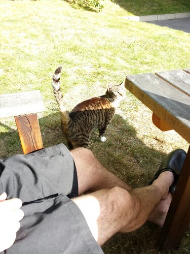 Satt utanför huset när en kisse dök upp och ville få uppmärksamhet.