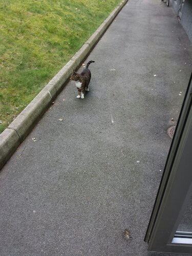 Bara att följa med. Plingade på där hon ville in, ingen öppnade. Kom dock en granne som presenterade kissen som Mjau och släppte in henne i sin lägenhet. Smart och tydlig kisse.