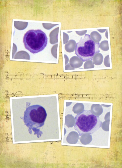För den som inte vet vad det föreställer, så är det lymfocyter i blodet. Det är vita blodkroppar, som vi tittar på i mikroskop varje dag.