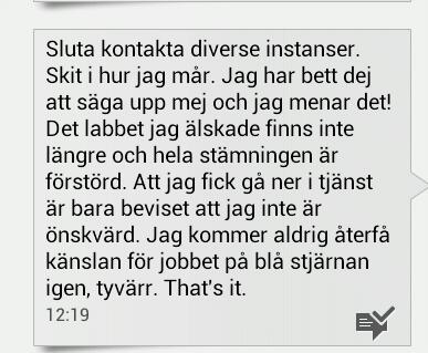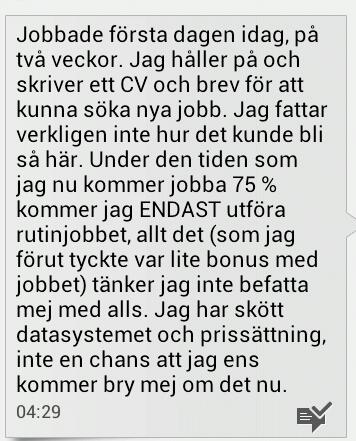 Först blev jag nedgraderad till 75 %, sedan fick jag detta mejl från den idiot vi hade som tf chef: