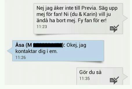 Nu har den jävla skitchefen kontaktat Previa och härjat. Messade ovanstående tillbaka.