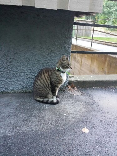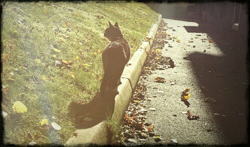 Satt utanför huset när en kisse dök upp och ville få uppmärksamhet.