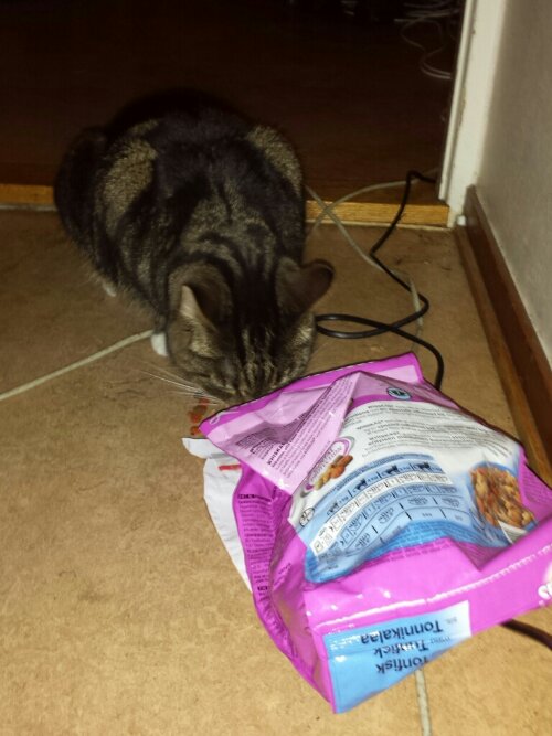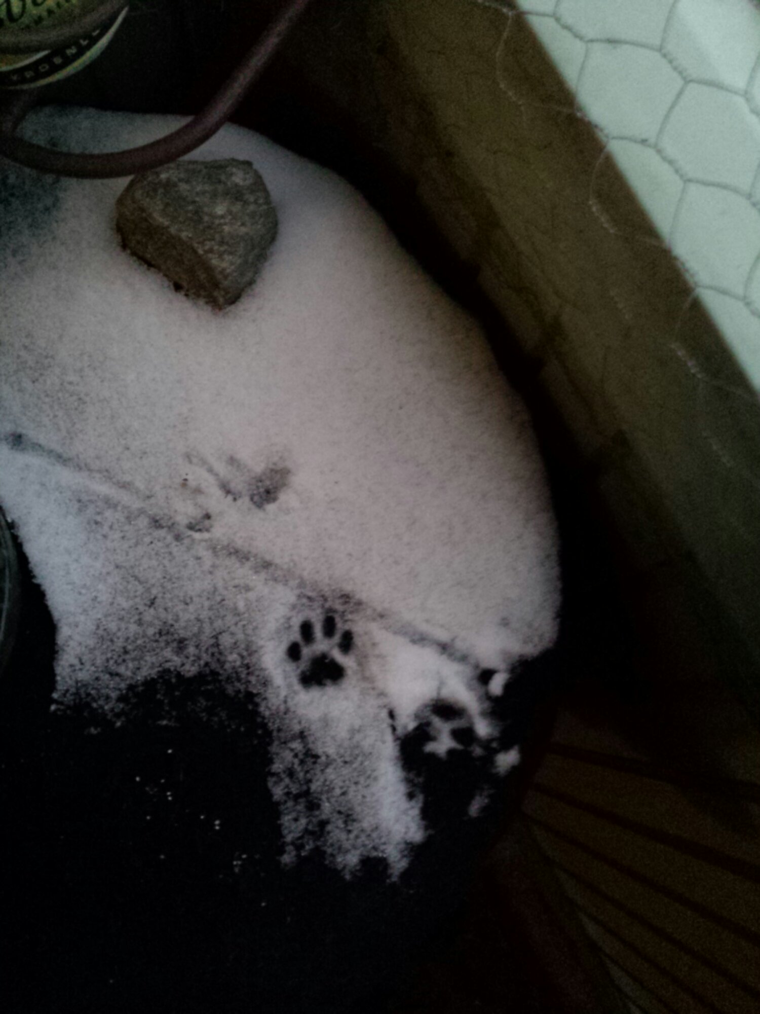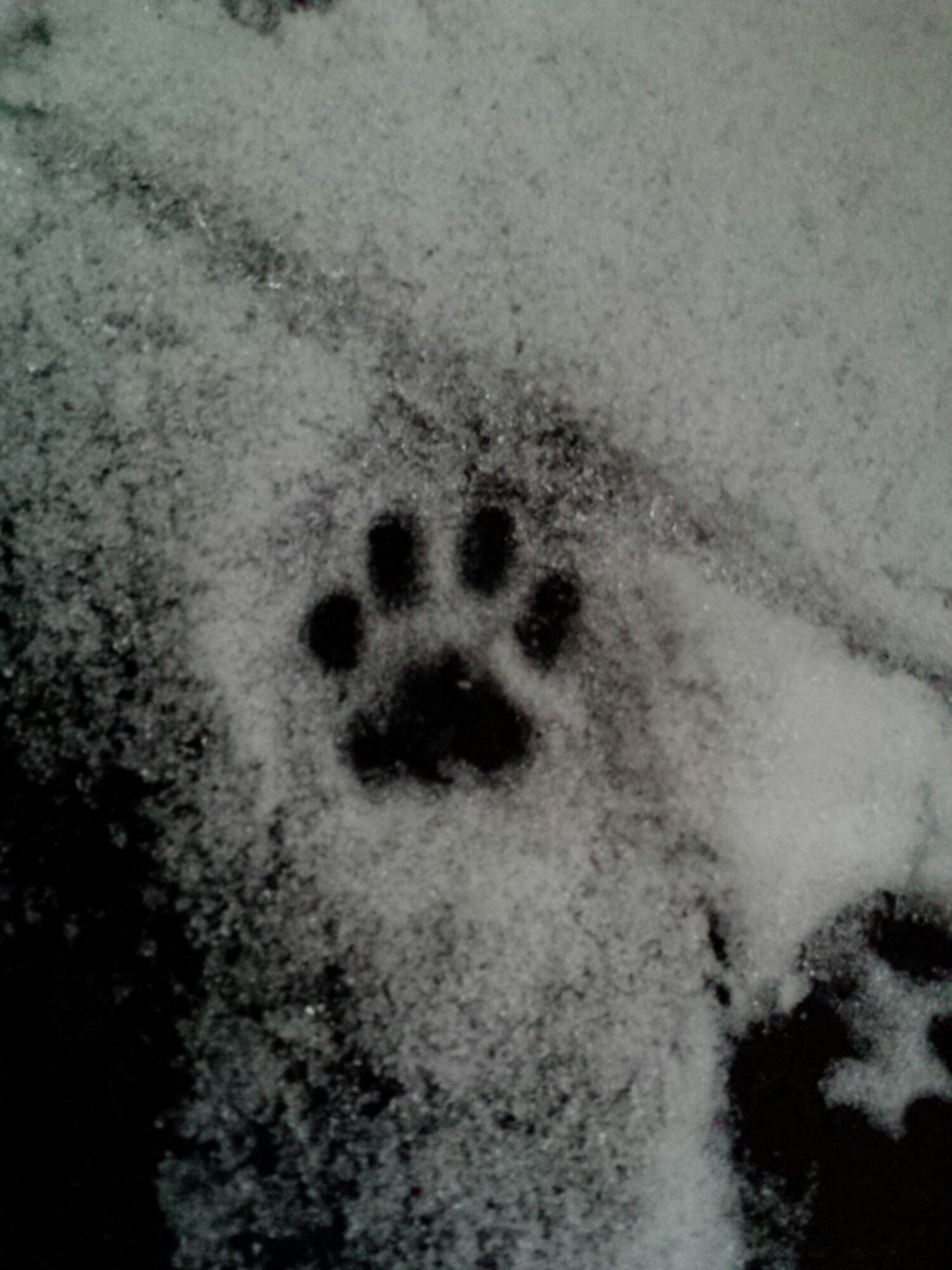 Smullibuttan är skyldig till avtrycket, men jag vet inte hur hon lyckades med att bara sätta en enda, och så tydligt avbildad, tass i snön. Gissar på att snön och dess kyla skrämde henne, men hade velat se hennes reaktion. Lilla snuttan!