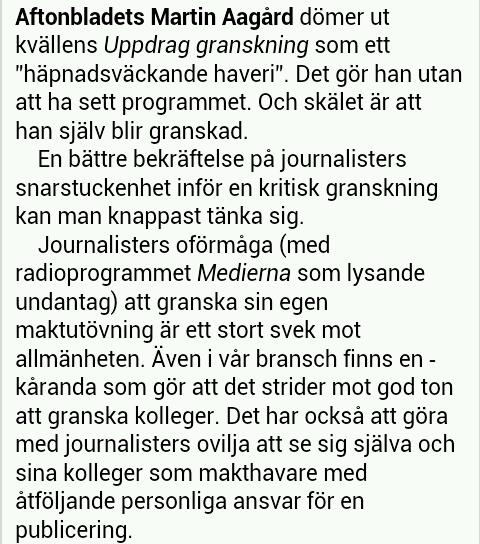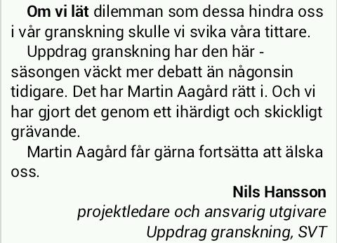 Sedan kom Martin Aagårds kritik (och, därmed, försök att avfärda och neutralisera det kommande programmets innehåll: ”Usch, hemska UG har granskat mej! Jag som inte alls är PK eller vill trycka på svenska befolkningen mina PK-idéer.”