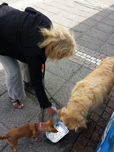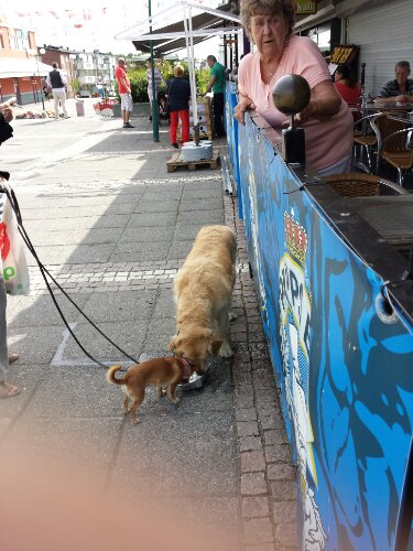 Jag började, givetvis, prata med dom under de 3 minuter jag skulle färdas ner till torget. Jag visste inte att dom kände varandra, så jag frågade om den lilla korvhunden var rädd för den stora.
