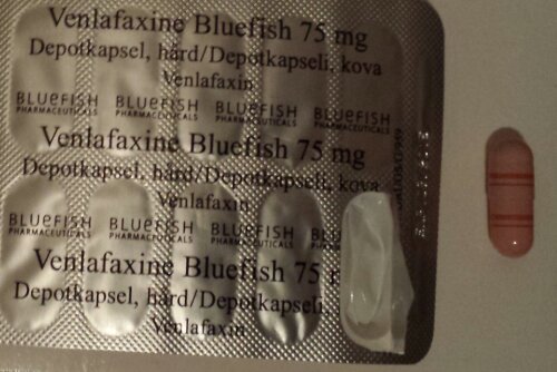 Hämtade ut 75 mg Venlafaxin. När jag kom hem såg jag att de hette Bluefish. Hur gulligt är inte det? Sen visade det sej att de var blekrosa… Kul 😀