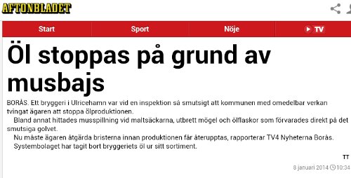 Det jag dock reagerade på (efter att ha läst denna oerhört fascinerande artikel) var att det inte avslöjades vilken öl det rör sej om. Seriöst! Barnvagnar, barnmat, gosedjur, IKEA-möbler, lasagne m.m. dras in p.g.a. mindre ”problem”. Så att folk eventuellt har köpt och druckit, eller har denna öl hemma, är inte viktigt. Jag kanske är kinkig, men musbajs i min öl är inte helt ok. Vore faktiskt läge för stämning om man hade druckit denna musbajsöl.