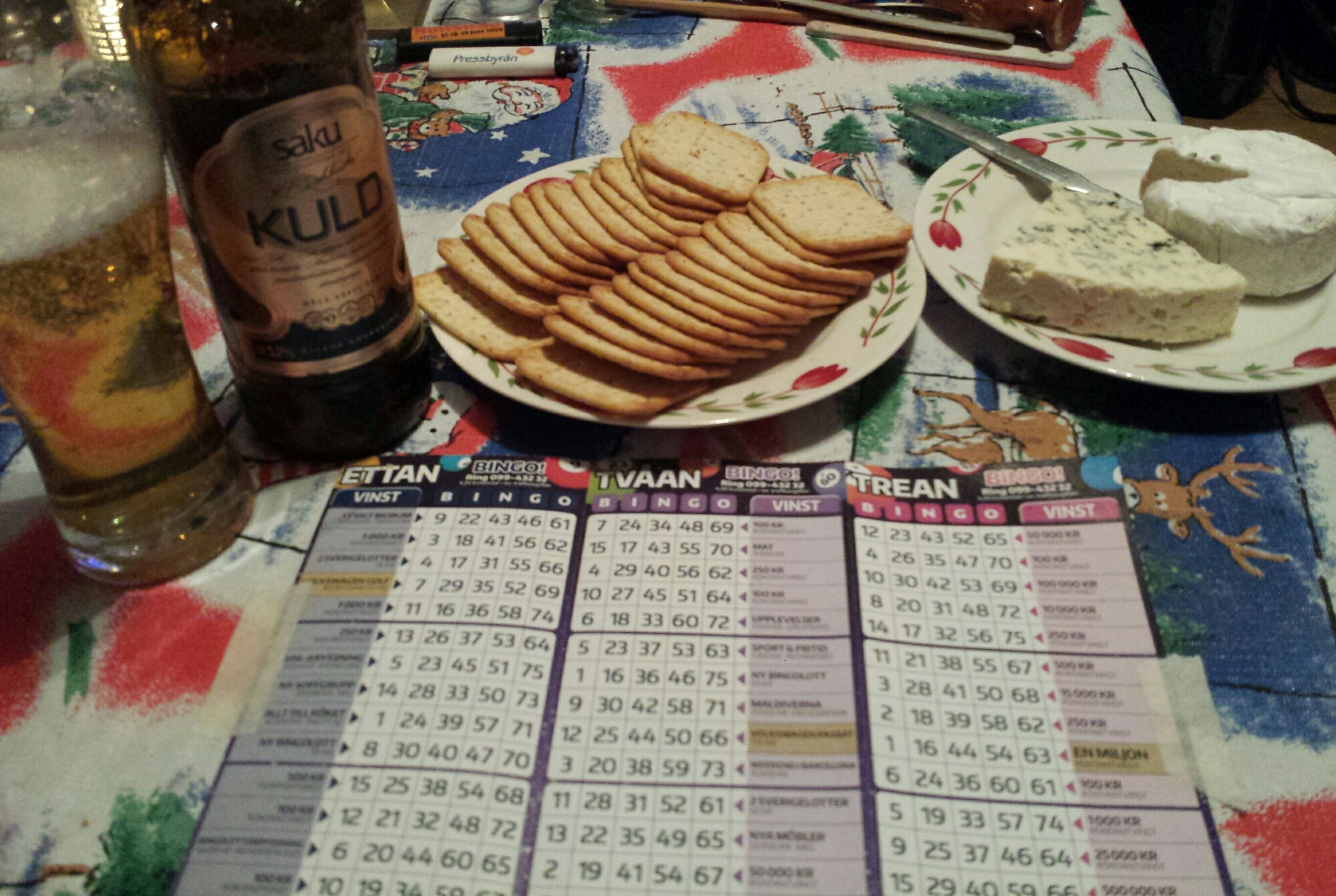 Öl (estniska Saku) från mamsen, kex, ostar, chips, dip och Bingolotto. Fulländad kväll!