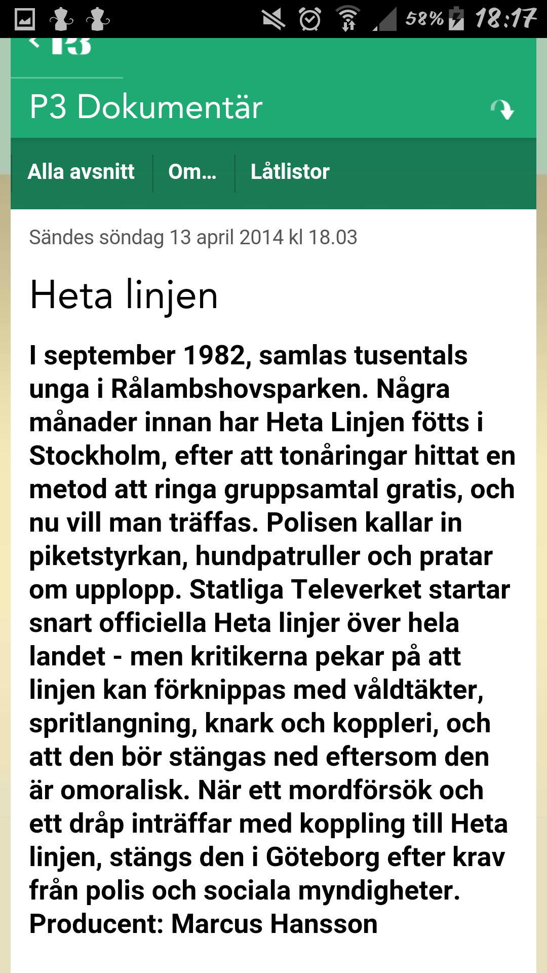 Jag älskar de välgjorda dokumentärer P3 gör, men detta är ett skämt. Har dom bett en snubbe med brytning att berätta bara för att det handlar om en förort? Det låter fruktansvärt. Ska man inte prata normal svenska på normal svensk radio? Ärligt, det jag mest stör mej på är att det ALLTID har varit lugna, vältalande personer som har lett P3-dokumentärerna, men nu helt plötsligt ska det vara PK? Jag vill höra vanlig svenska, snälla! Tänk om jag hade barn och de bara blev utsatta för denna vandalisering av vårt underbara språk. Då dör vårt språk ut.