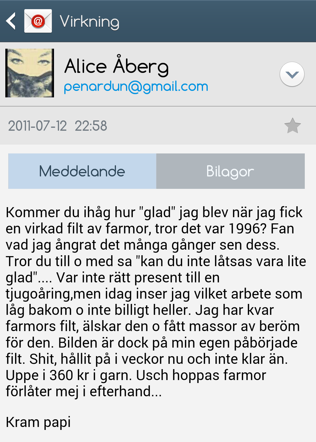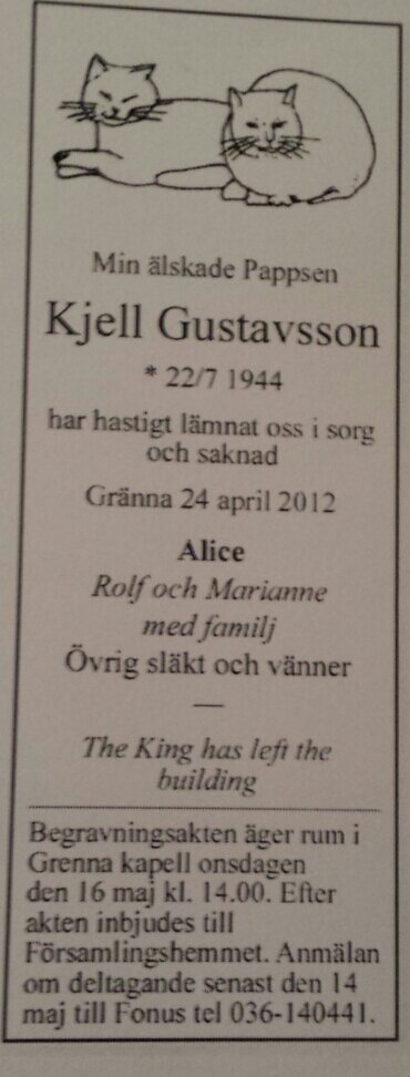 Jag vet att vi hade ett långt samtal när min bulimi uppdagades (1993, 18yrs) och jag förstod hur svårt han hade att ta upp detta med mej. Jag kände där och då att jag hade lämnat hans sfär och blivit en kvinna som inte var pappas dotter. Efter detta begränsades våra möten till att jag och B. (mitt ex) åkte till Gränna och drack folköl med papi på hans balkong emellanåt. Vi snackade Kennedymordet, Sex Pistols och annan nostalgi. Vi hade otroligt mysigt.