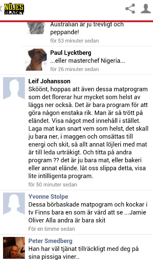 Sen finns det då personer, som Leif och Yvonne i kommentarerna ovan. De visar helt öppet hur tråkiga liv de har. Det är, typ: ”Jag hatar alla former av matlagningsprogram och tittar inte alls, dock tar jag mej tid att läsa en artikel om sagda hatade programsort, formulera ett inlägg där jag rackar ner på en av programledarna, som jag inte vet något om, men kanske sett i en trailer (10 sek räcker väl för att bilda en fast åsikt på?) och sedan, som grädde på moset, ska jag visa upp mina oerhört dåliga kunskaper i det svenska språket och stava fel på alla ord med fler än två stavelser och särskriva på alla ställen som går”.