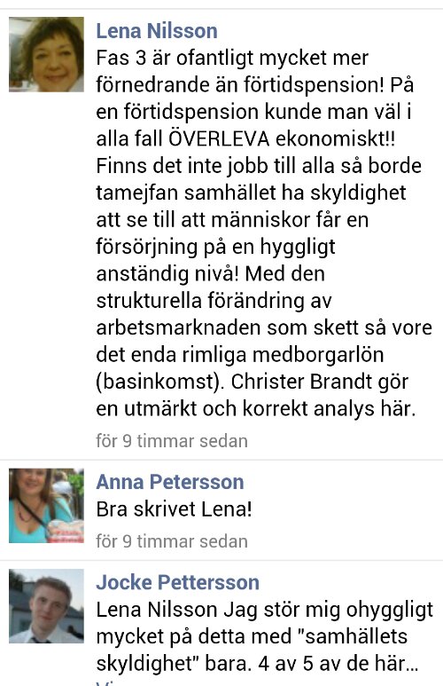 Sen ska vi bara inte snacka om fas 3 och andra vedervärdiga påfund! Där har jag, tack och lov, aldrig varit själv, men jag har svårt att tänka mej nån mer förnedrande ”hjälp” ut i arbetslivet. Det är ett hån!