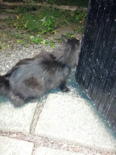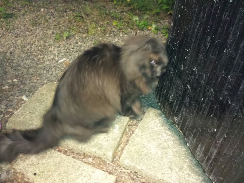Nufflo fick vara ute lite idag. Han blev så glad att träffa mamma att han höll på att gå upp i limningen. Yrade runt, stångades, buffade och jamade, var svårt att lämna honom.
