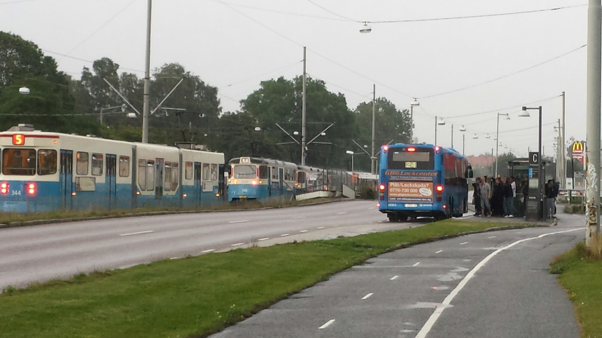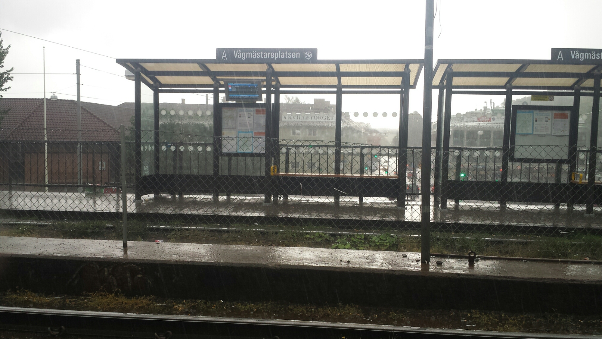 Var bara två hållplatser bort, så gick av och började gå. Kom världens ösregn. Hoppade på en buss, som tog mej en hållplats för långt, fick sen gå i HÄLLREGN utan dess like. Mina strumpor går att vrida ur. Fy Fabian!