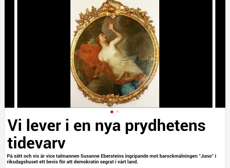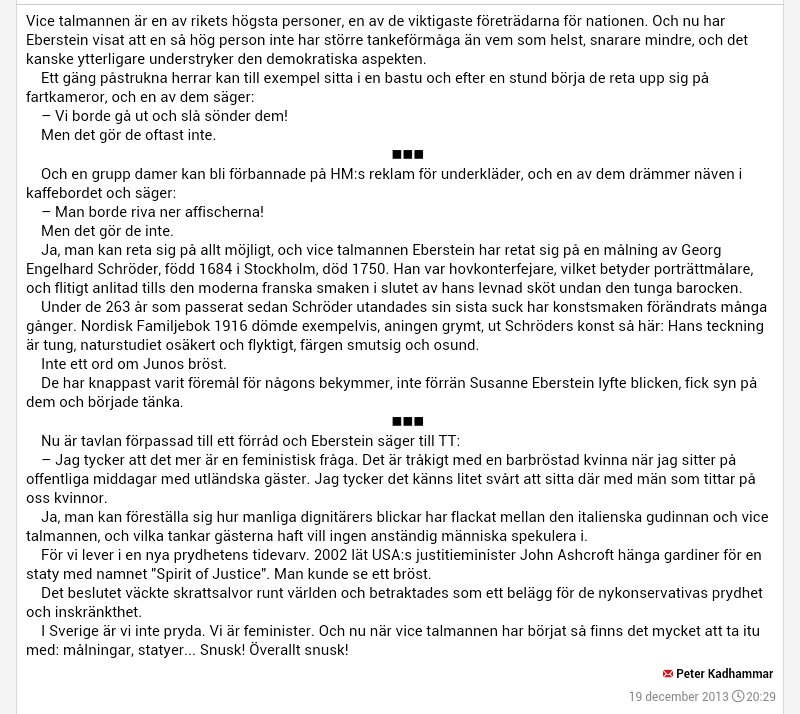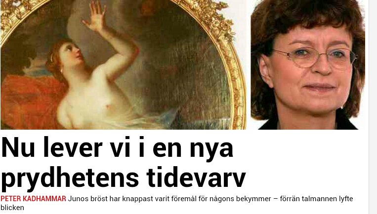 – ”Överfeminismen”: speglas i artikeln ovan. Att i sin iver att vara PK, få för sej att ett 300 år gammalt konstverk förmodligen upprör någon (vem denna någon är, eller om denna någon har frågats om sin påstådda upprördhet, framgår inte) och därmed måste bannlysa detta vedervärdiga konstverk är så knasigt, att jag har svårt att finna ord. Att inte ens överväga konstverket och konstnären och hur samtiden skildrades, skönheten hos den kvinnliga kroppen eller nyttan med att visa upp vår kulturskatt och vårt arv från våra tidigare generationer utan bara se ”bara bröst” är så obota korkat, att jag inte ens har någon vidare kommentar.