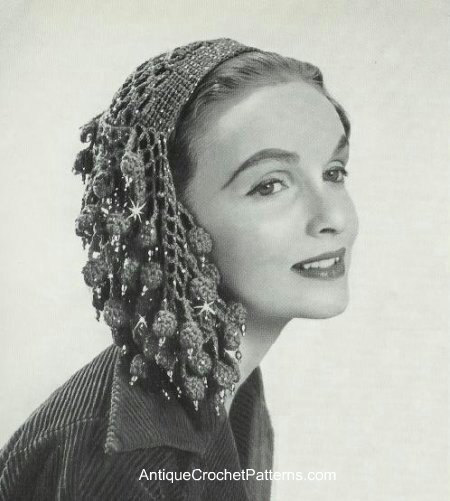 Jag vet inte vad den här typen av ”hårprydnad/halvhatt” heter på svenska (snood på engelska) men när det gäller vintagemönster (virkning) så finns det massor från 40-talet på nätet.